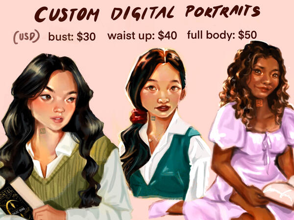 TERMS OF SERVICEPlease read thoroughly before commissioning me!- Commissions are strictly for personal use only. Editing, reselling and/or making merchandise out of the art is not allowed. For commercial use, please send me an email- When sharing the artwork, please give full credit- Please provide clear reference pictures : clear face, background, outfit (Commissions based on description only will be charged extra.)- Once payment is settled, your slot is booked and I will soon send you a rough digital concept before starting the physical painting for approval.- I do not accept cancellations once I have started your painting. If, for whatever reason, I cannot complete your commission, you will receive a full refund.- I will email you the final piece as a PNG file to preserve quality. You can ask for different canvas sizes (e.g. for phone/laptop background)- I reserve the rights to my artwork. (However, you can let me know if you prefer that I don't post it publicly.)- Turnaround time: between 3-6 weeks (depending on complexity and my own schedule & workload). Your patience is greatly appreciated!- I will update you with my progress and any changes or delays (if any).